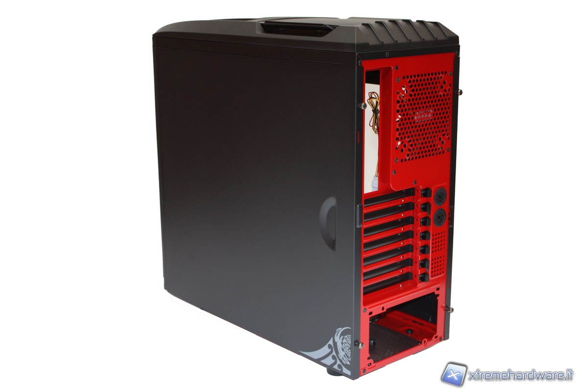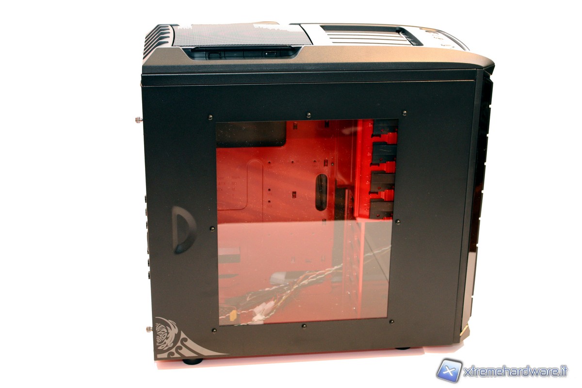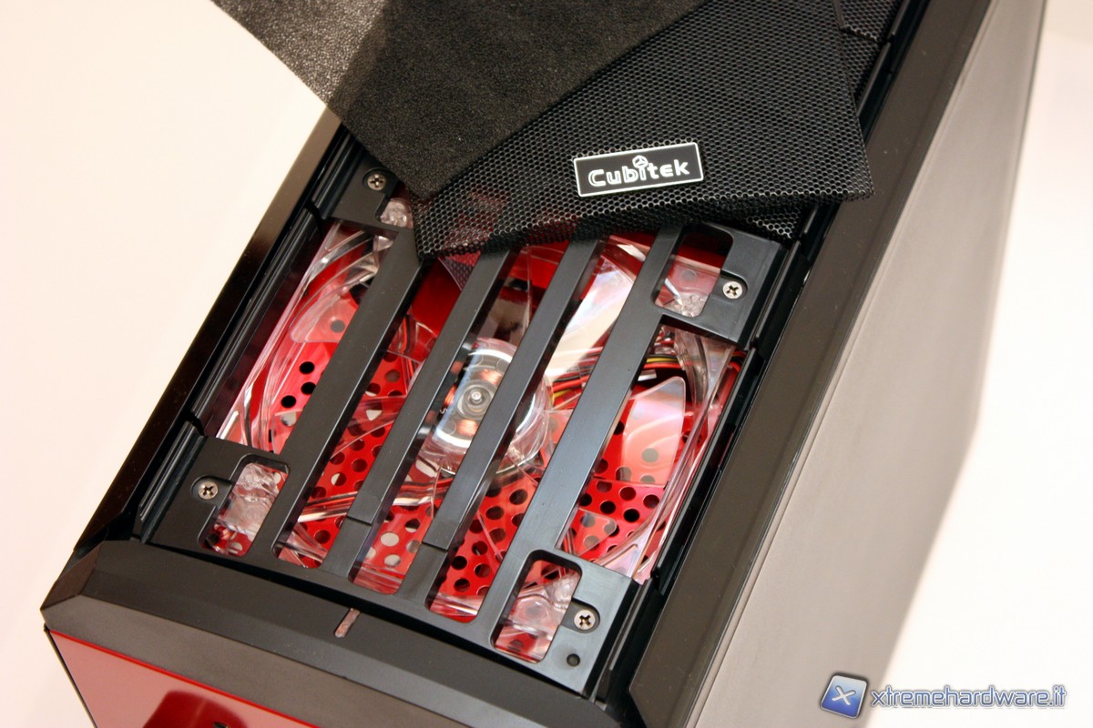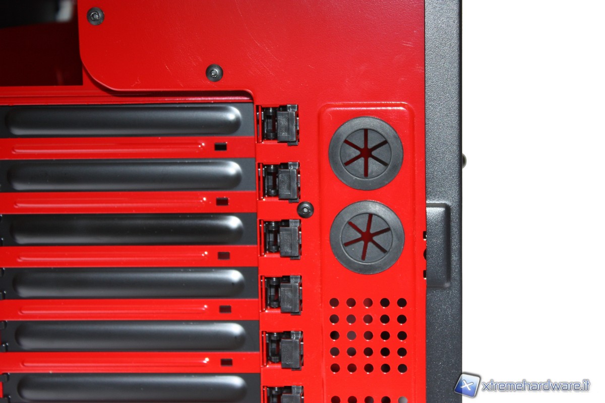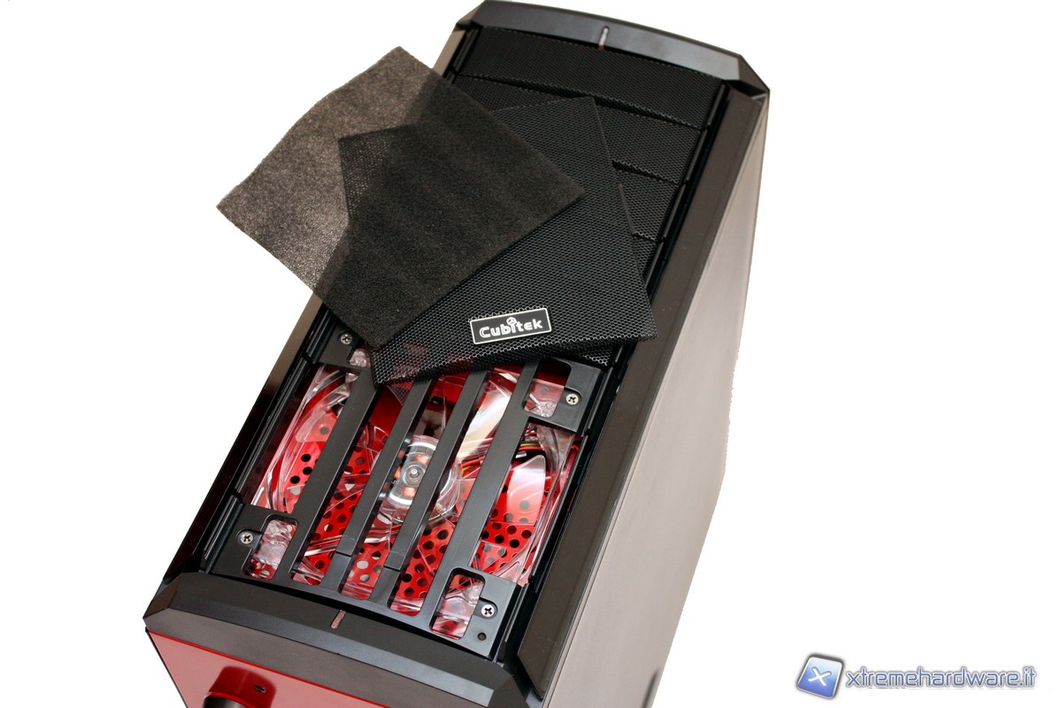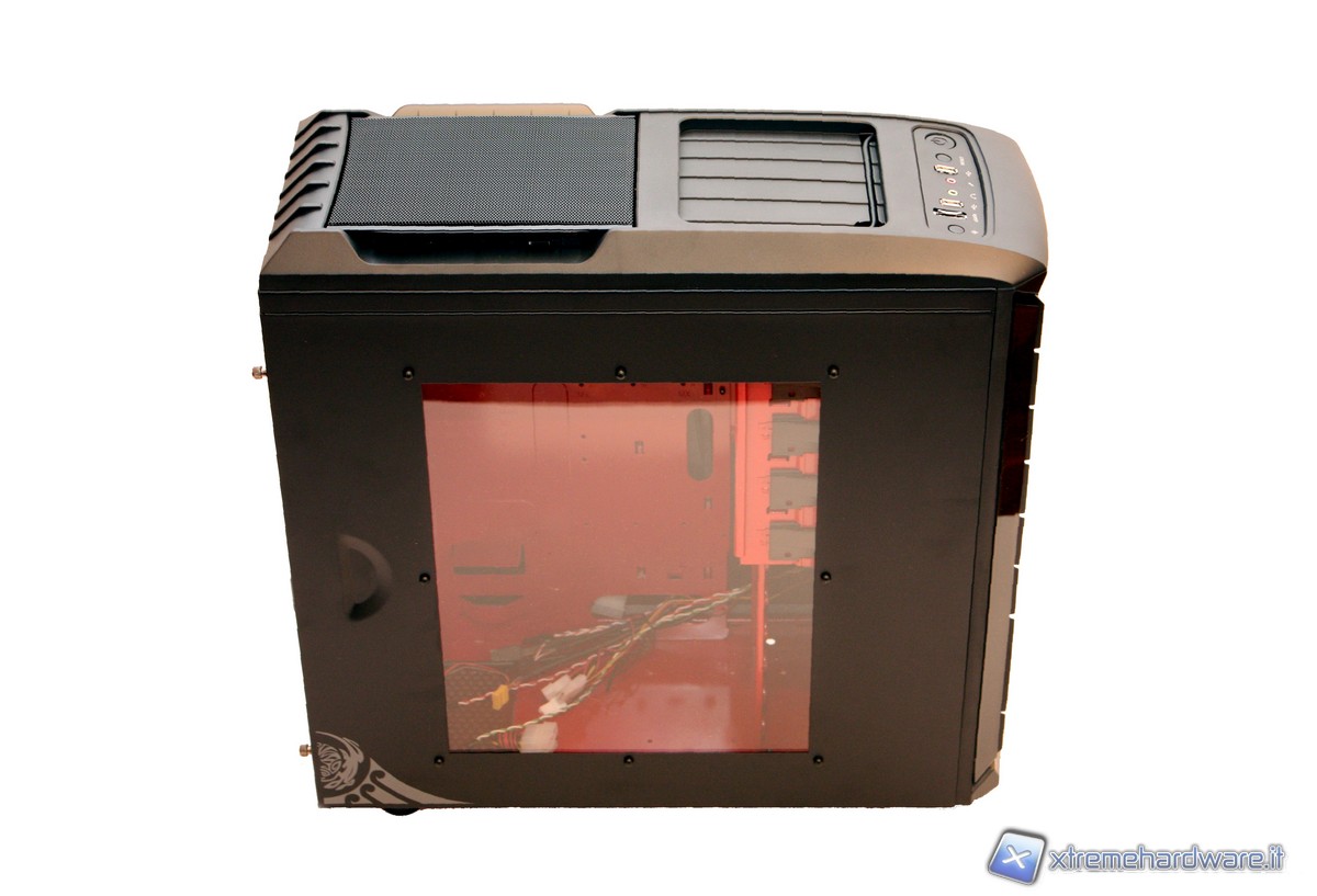 La parte superiore è forse quella più interessante, infatti troviamo un alloggio per periferiche mini usb (davvero utile per i cellulari predisposti con questa connessione), i pulsanti di accensione e reset, e il controllo led delle ventole, che quindi possono esser accesi o spenti a piacimento. Sono presenti inoltre i jack per il microfono e le cuffie, 2 porte USB 2.0 e una eSata. E' inoltre inserita una ventola in estrazione da 140mm dotata anch’essa di led rossi e filtro antipolvere, anche in questo caso rimovibile a piacimento smontando il pannello superiore con una semplice pressione.