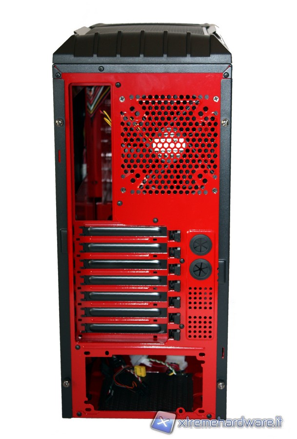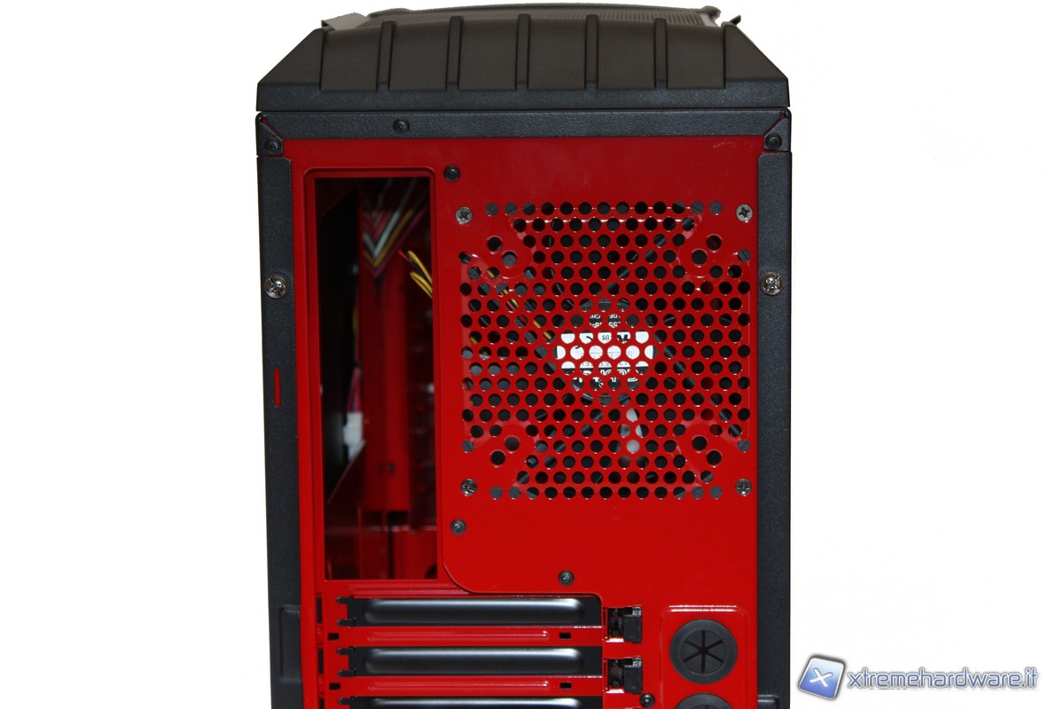 Nella parte posteriore troviamo una ventola da 120mm in estrazione (è una silent-fan priva di filtro antipolvere), 7 slot per l'istallazione delle periferiche, due fori per eventuali tubi di impianti a liquido, il foro per l'alloggiamento dell'alimentatore (in basso).