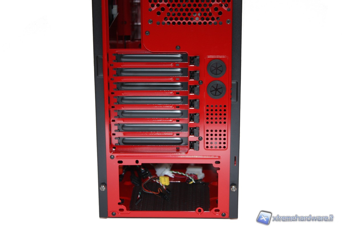 La parte inferiore, anch'essa verniciata di rosso, presenta 4 piedini di gomma antiscivolo/vibrazione e la griglia (dotata di filtro interno antipolvere) per l'alloggiamento dell'alimentatore. Il filtro dell’alimentatore purtroppo non è facilmente removibile dal momento che occorre smontare l’alimentatore per poterlo pulire. Avremmo preferito un filtro estraibile dalla parte posteriore del case.