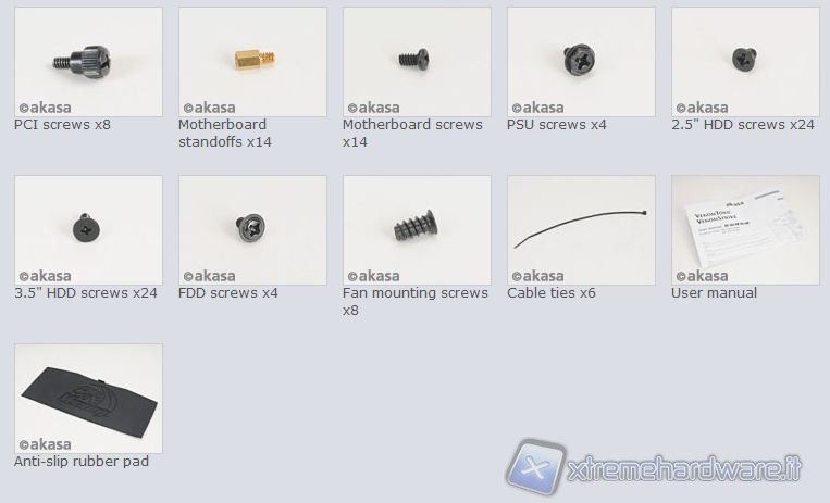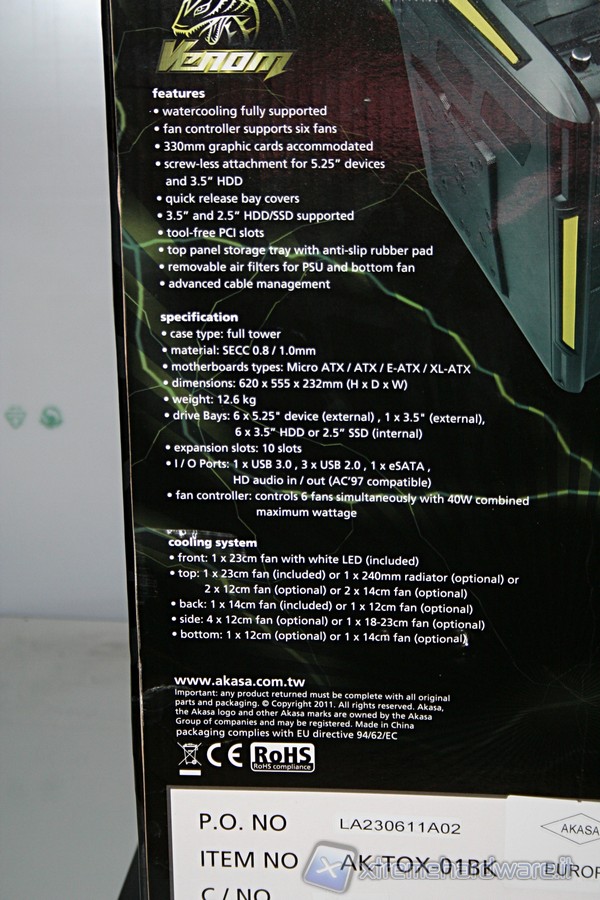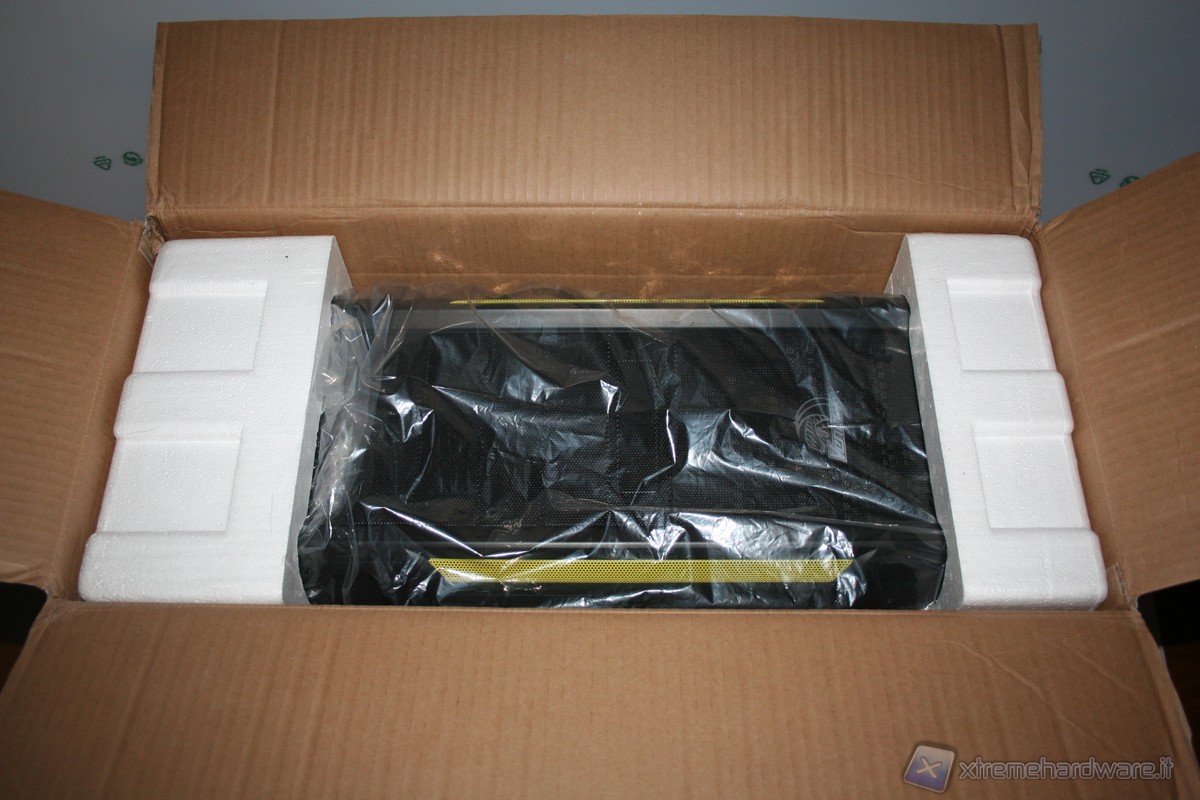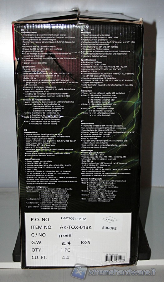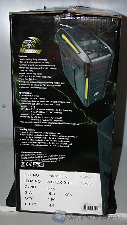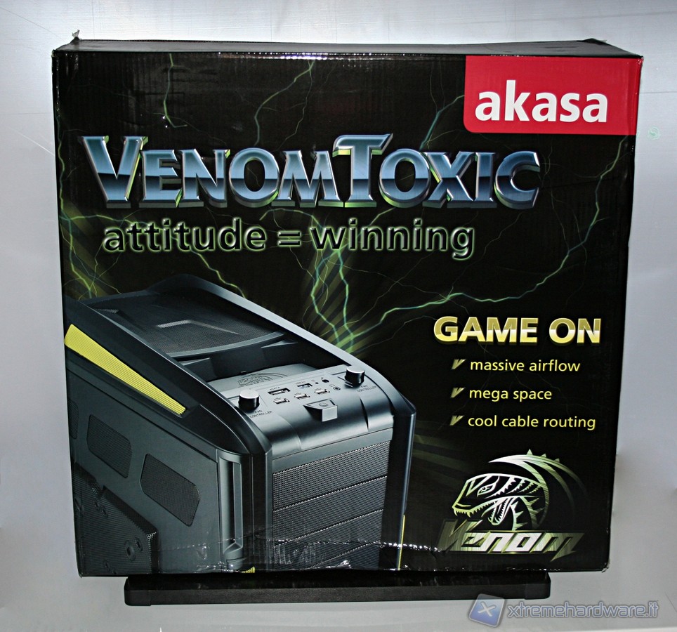 Dopo aver presentato le caratteristiche dell’Akasa Venom Toxic, è giunto ora il momento di vederlo più da vicino. La confezione esterna è curatissima nei dettagli, nelle informazioni e nella presentazione del cabinet. Ottime le immagini riepilogative delle features, come ottimo e adeguato è l’imballo dello stesso. E’ stato avvolto nella consueta copertura di plastica, contro eventuali graffi accidentali ed è presente del polistirolo per il bloccaggio all’interno della confezione. Anche se dovessero esserci pesanti sollecitazioni, state certi che il contenuto non subirà il minimo danno. La cura per i dettagli la si trova anche all’interno del cabinet stesso in quanto il volume interno è stato riempito con plastica da imballaggio e cuscinetti d’aria. Un ottimo lavoro, non c’è che dire. Il bundle in dotazione è davvero minimale, le ventole sono già state montate all’interno del case quindi tutto quello che è necessario sia al montaggio che alla funzionalità stessa lo troverete già assemblato.