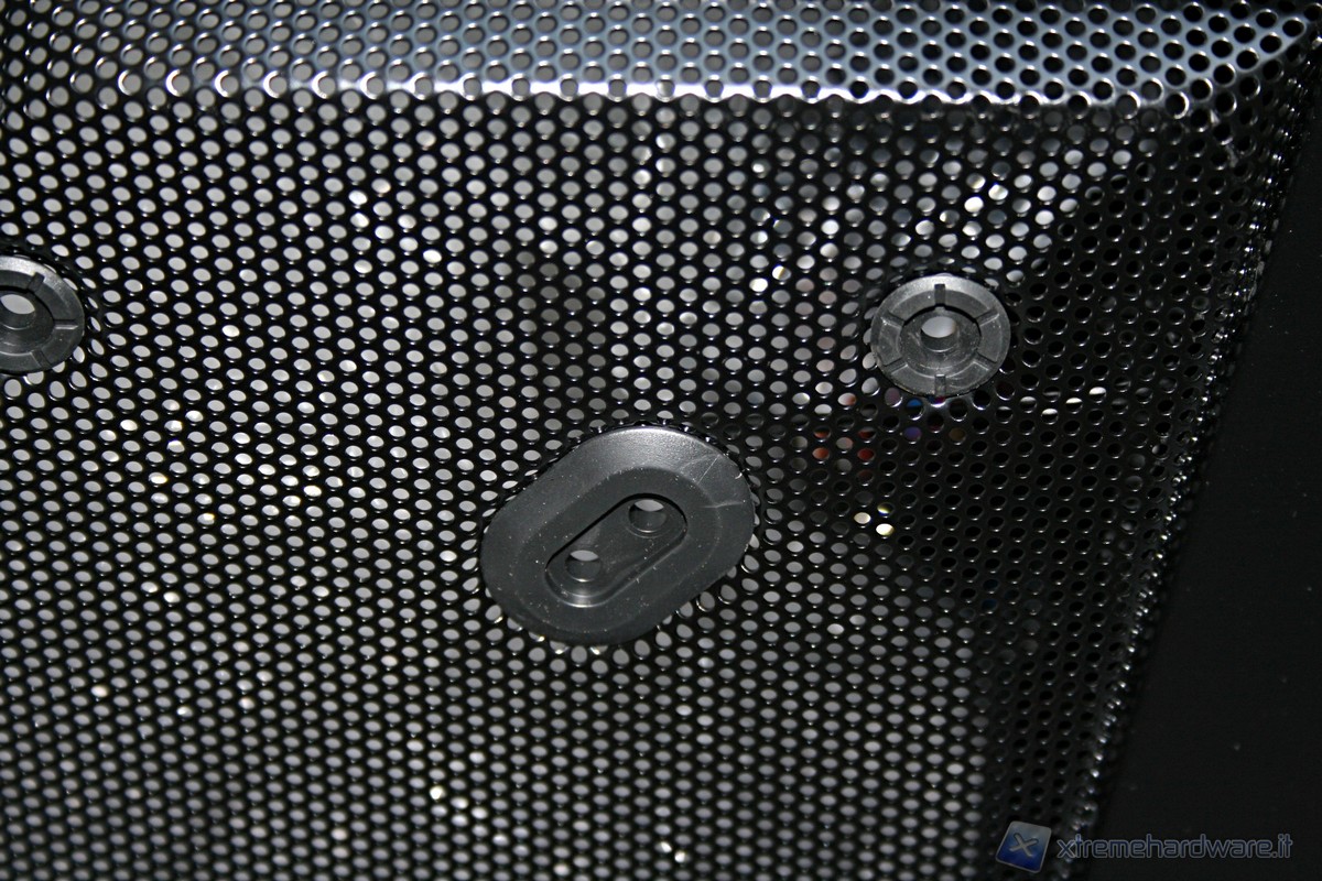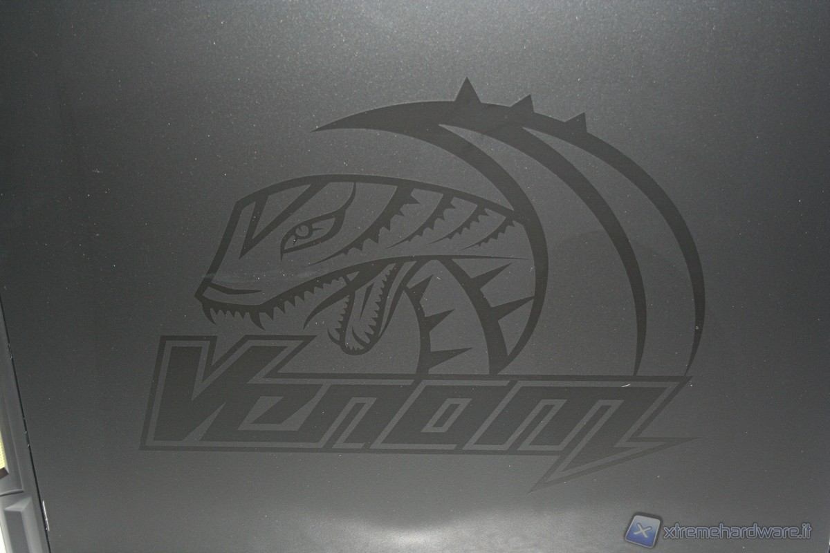 Nel lato sinistro è presente la paratia perforata dove sarà possibile alloggiare ben 4 ventole da 120mm oppure una singola da 140mm in posizione centrale, alternativamente una 180mm oppure persino una 230mm. Ottime le rifiniture come l’estetica complessiva, a dimostrazione di questo notiamo persino la presenza di profili gommati antivibrazioni per ogni singola ventola. Nella parte superiore poi troviamo ben tre griglie in grado di fornire ventilazione addizionale. Nella parte destra invece troviamo solamente il logo della serie Venom molto ingrandito, d’effetto e curato esteticamente. Le paratie vengono rimosse tramite delle classiche e grandi viti, svitabili a mano, di colore nero, che ben si intonano con la colorazione del case.