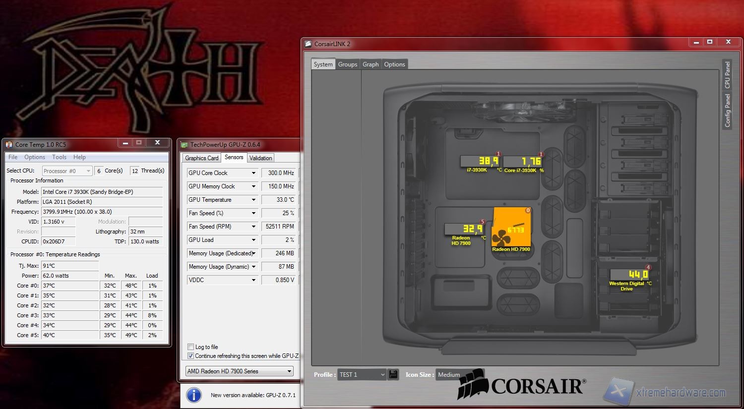System: da qui potrete osservare direttamente sullo schermo le temperature, ripartire con delle icone che possono essere spostate e posizionate sopra le componenti. Sono disponibili diversi sfondi, raffiguranti cabinet Corsair, ma possono essere importate immagini personali, come vedrete a breve. Da qui, cliccando su ogni icona, è possibile selezionare molti parametri; un particolare degno di nota, oltre alla presenza di diversi profili customizzabili (ad esempio “Silence” o “Turbo”), è la possibilità di settare diverse icone, e quindi componenti, all’interno di gruppi, come vedremo nella prossima schermata denominata appunto “Groups”. Nella seconda fotografia potete osservare che è possibile fissare sulla schermata i dettagli relativi alle opzioni ed alla temperatura e l’utilizzo in % della CPU. Facciamo notare che la temperatura della CPU corrisponde a quella massima rilevata da Coretemp mentre quella della GPU è relativa al “GPU Core”, rilevabile da GPU-Z. Senza scendere in inutili dettagli, è particolarmente lampante il loro utilizzo quindi vi mostriamo direttamente le fotografie: