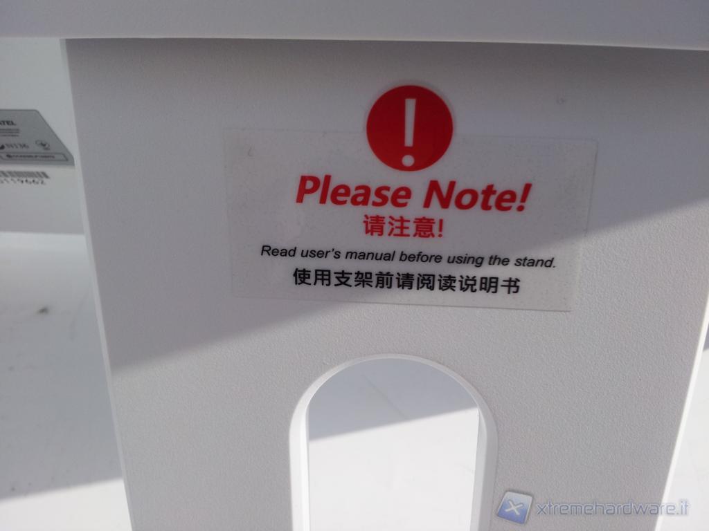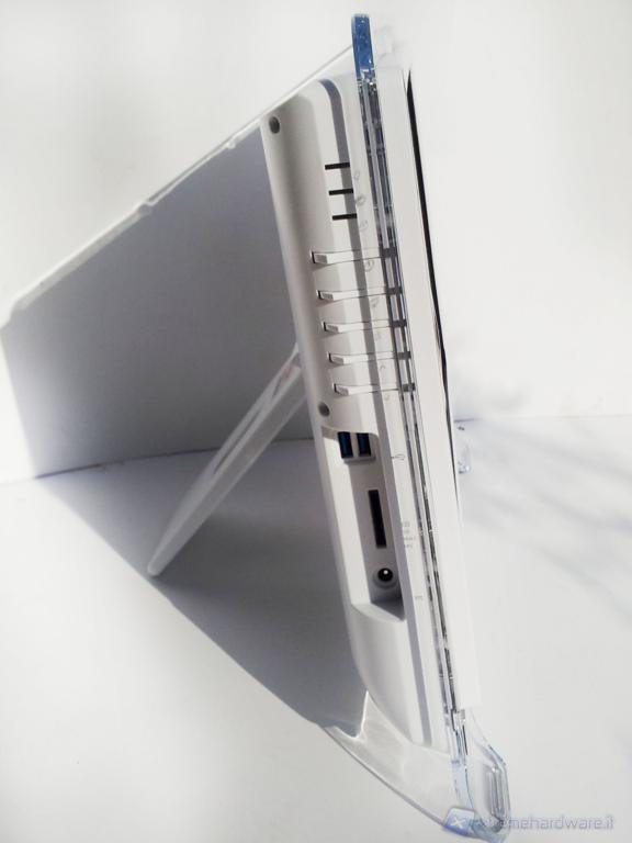 Posteriormente è presente il piede d'appoggio che permette una facile regolazione dell'inclinazione del PC, è inoltre presente un foro per il passaggio dei cavi.
