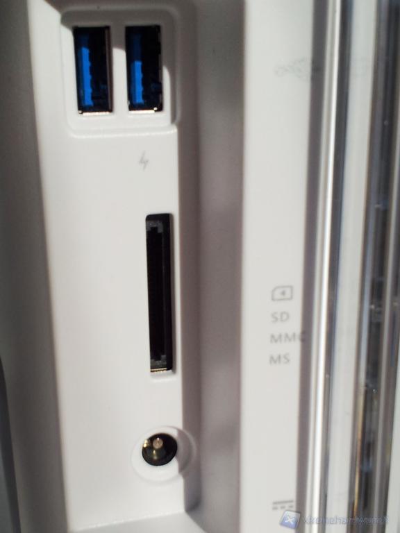 Nonostante il PC AIO sia abbastanza sottile lateralmente trovano spazio due porte USB 3.0 (contraddistinte dalla tipica colorazione blu), un lettore di schede e l'attacco per l'alimentazione. Poco più sopra, nella parte sinistra, troviamo anche i pulsanti per la regolazione e lo spegnimento del monitor e quello d'accensione dell'intero PC.