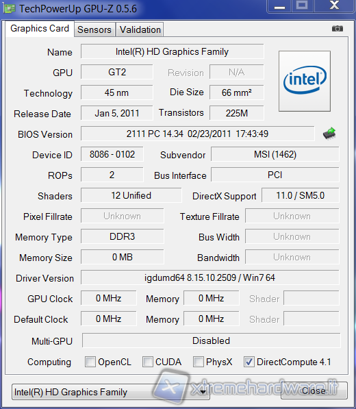Essendo una CPU di fascia bassa il Pentium G620 diminuisce i consumi del sistema che, grazie all'utilizzo della sola GPU in esso integrata, calano ulteriormente; L'AE2071 oggetto di recensione, infatti, non possiede una scheda grafica discreta ma affida tutte le operazioni grafiche alla Intel HD Graphics integrata, quest'ultima non è ben supportata dal software GPU-z pertanto, contrariamente da quanto si evince dall'immagine posta di seguito, non è predisposta per le librerie DX11.