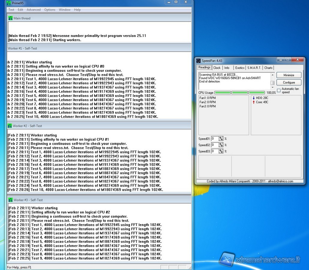 Passiamo adesso all'analisi delle temperature rilevate sulla CPU, sia in stato di riposo (idle), sia in stato di massimo carico operativo (full load). A tal proposito abbiamo usato per mettere sotto stress la CPU, che nel nostro caso è il modello triple core AMD Athlon II 450, l'ottimo software di stress testPrime95 vers. 26.11. Abbiamo fatto le letture delle temperature rilevate tramite l'utilizzo del software SpeedFan nella versione 4.43. Rileviamo qui come, in condizione di riposo, i valori di temperatura rilevati siano eccezionalmente bassi, merito dell'efficacia del sistema di dissipazione e dei sistemi di risparmio energetico della nostra CPU, attivi in idle.