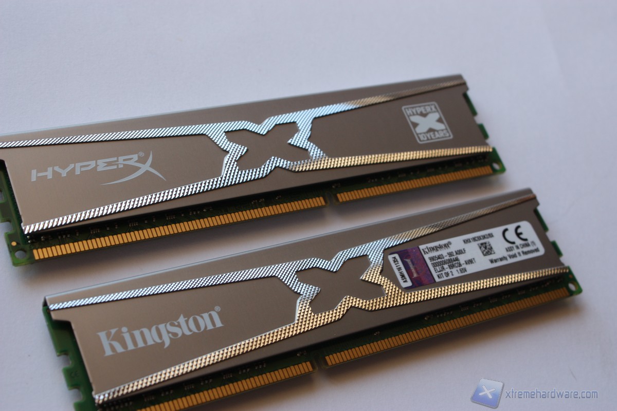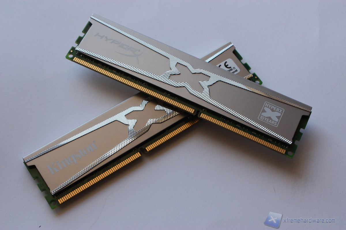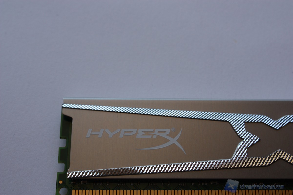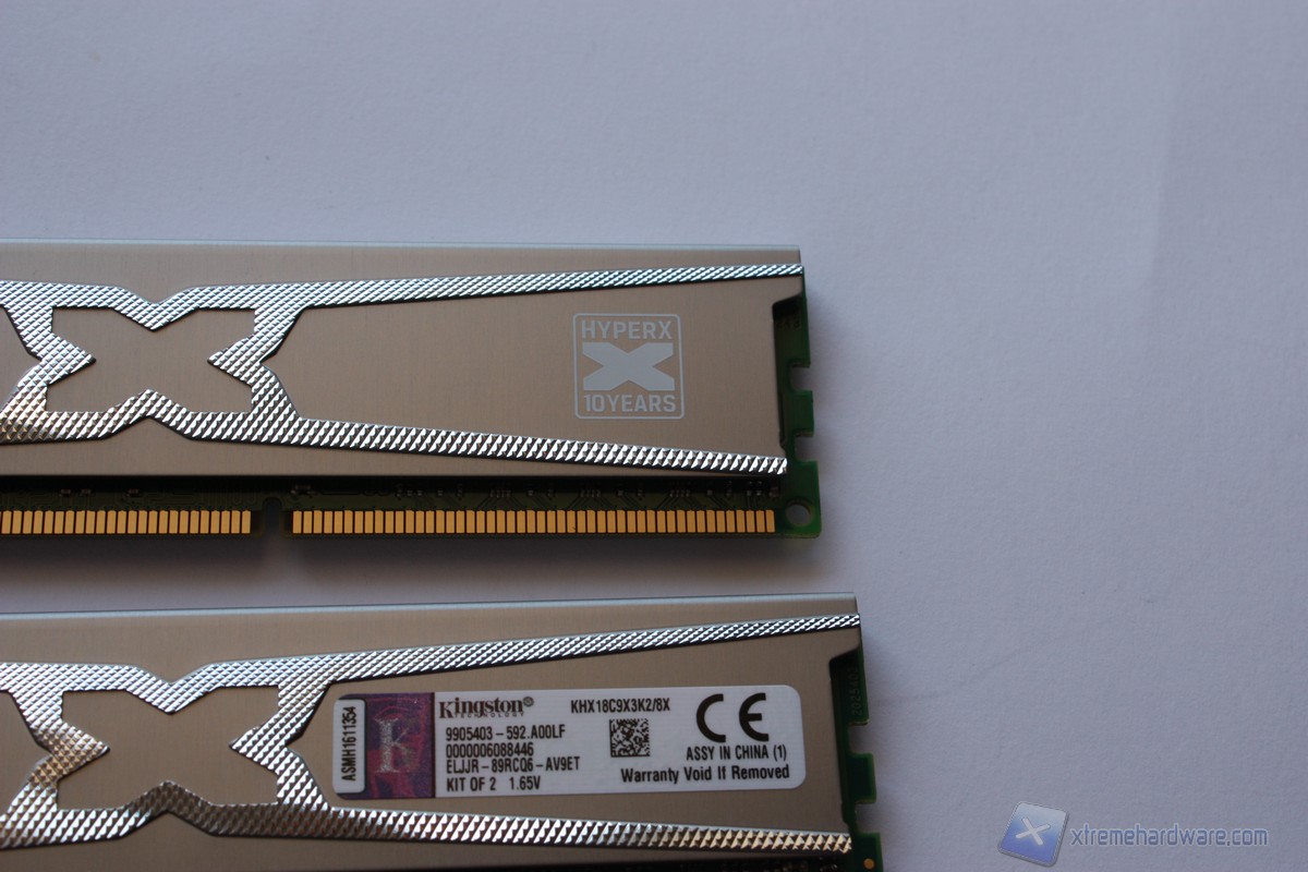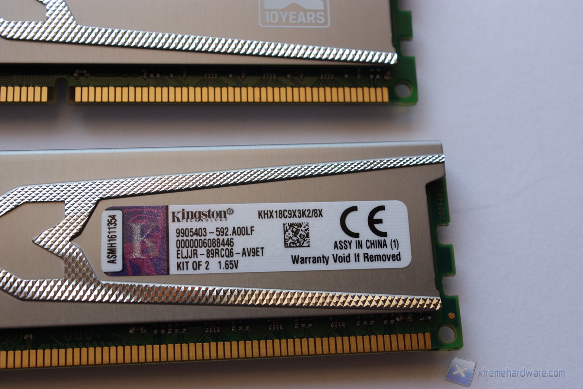 Vediamo quindi da vicino i singoli moduli. Il colore scelto per il dissipatore è l’argento; l’intera superficie è caratterizzata da un disegno ad X con finitura ruvida che conferisce una gradevole sensazione al tocco. Sul dissipatore spiccano inoltre il marchio di Kingston ed il nome HyperX 10 Years, serie di cui queste memorie fanno parte. Su di un lato sono riportate le sigle che identificano il nostro kit ed alcune caratteristiche tecniche.