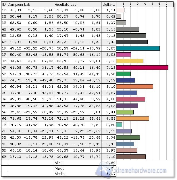 La fedeltà cromatica nelle condizioni out-of-box risulta scarsa, con un Delta-E medio di 3,17.