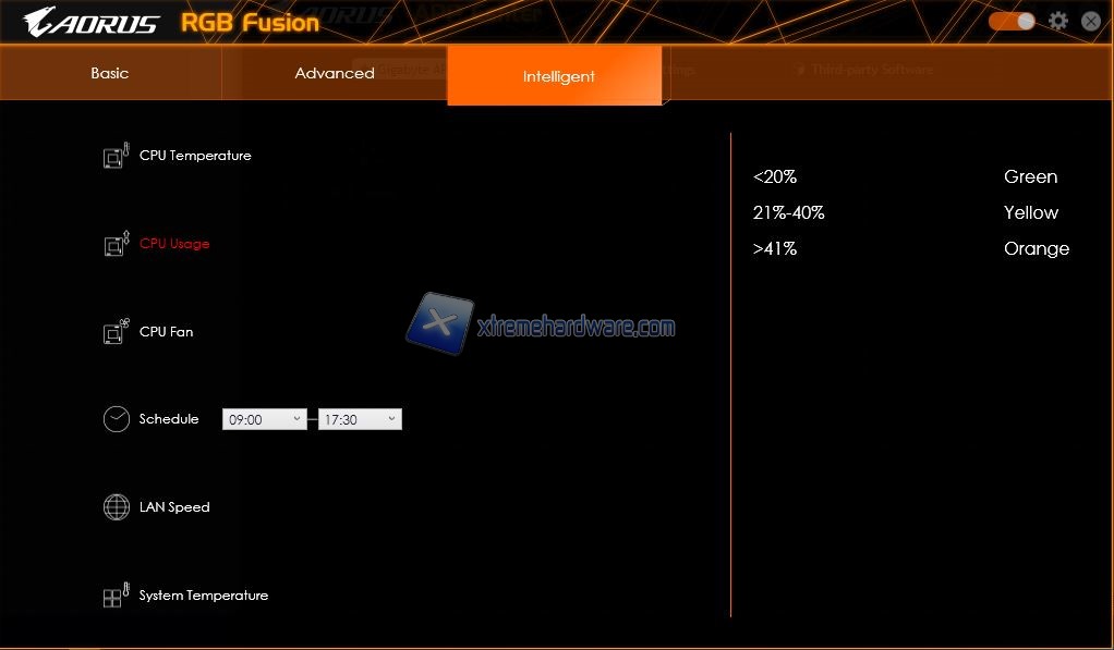 Infine in ‘’Intelligent’’ potremo settare il colore in base alla temperatura della CPU o della GPU o selezionare una delle altre opzioni a disposizione.