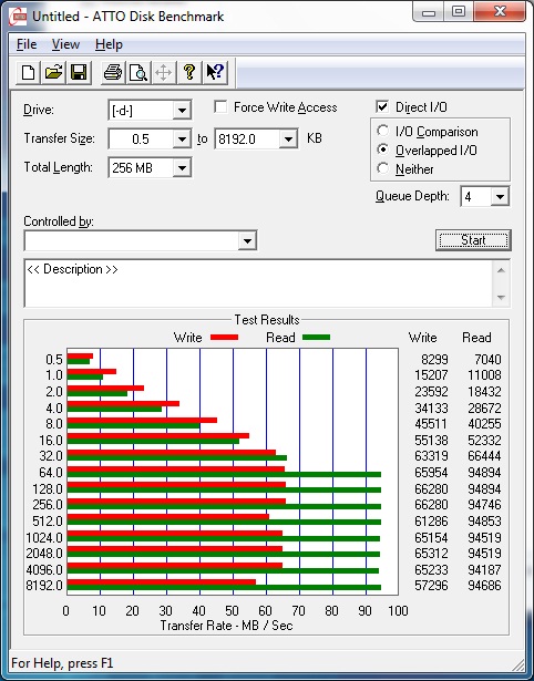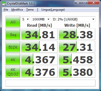 Con ATTO e CrystalDiskMark procediamo a testare la velocità sulle porte USB 2.0 e USB3.0 in dotazione alla Z68MA-ED55. I test sono effettuati con il pen drive Kingston DT-Ultimate 64GB recensito qui. ATTO è in sintesi un programma che misura la velocità di trasferimento dati degli hardisk connessi sulle porte USB e lo fa restituendo la velocità di trasferimento in lettura e scrittura di pacchetti di dimensioni crescenti, si parte da 512KB per finire agli 8MB. Stesso discorso con CrystalDiskMark, che esegue però test diversi evidenziando le prestazioni con dati più aleatori e usando una Queue Depth di 32 per i file di dimensione 4k.