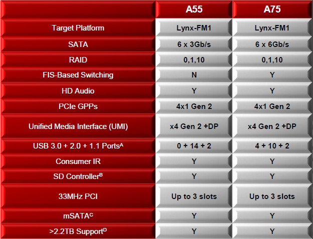 Come ci suggerisce il nome, tale mainboard è dotata di chipset AMD A55, fratello minore dell’A75.Come possiamo notare dall’immagine sottostante, le differenze tra i due chipset risultano essere principalmente la mancanza di collegamenti SATA 6Gb/s e USB 3.0 nel modello A55.