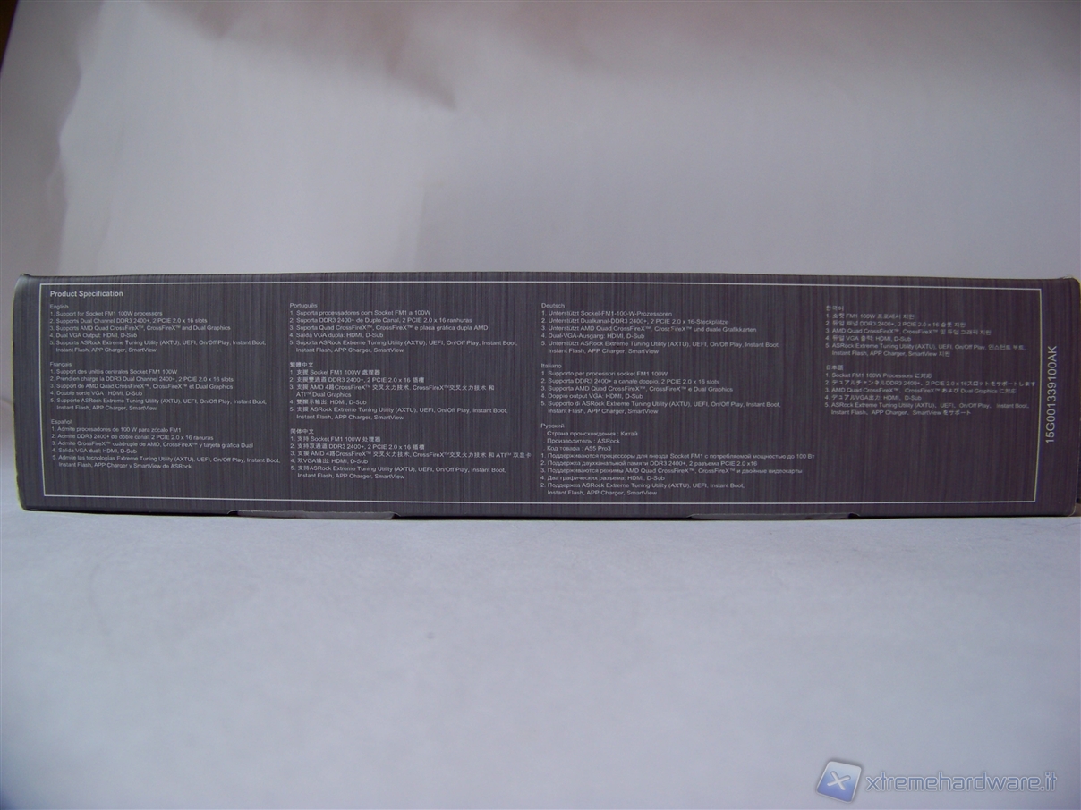 Sul lato destro della confezione troviamo, oltre che il nome della mainboard, i contatti dell’assistenza tecnica ASRock, mentre sul lato sinistro una tabella scritta in undici lingue differenti, riportante le caratteristiche tecniche del prodotto.