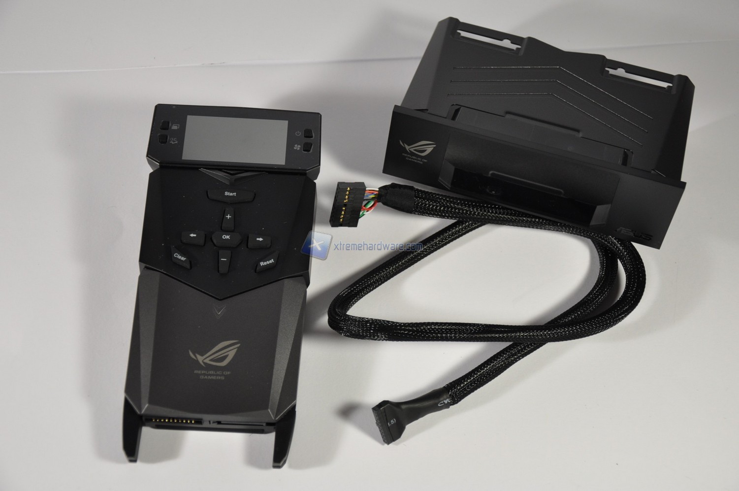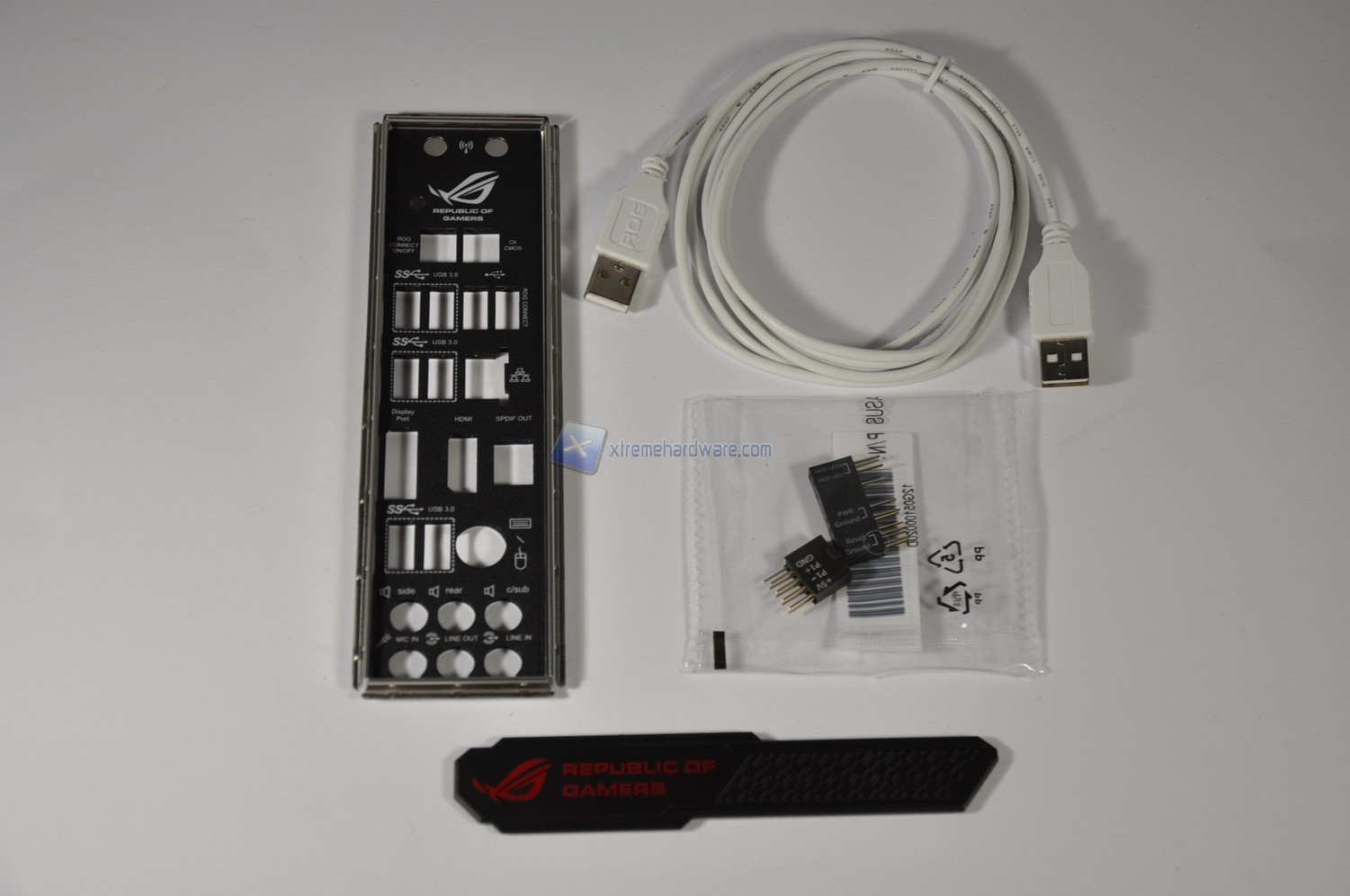 Troviamo com’è d’uopo la mascherina per l’installazione all’interno dello chassis, il cavo USB-to-USB per attivare la funzionalità ROG Connect, degli header per facilitare la connessioni dei cavi dello chassis e un gadget per sfoggiare la nostra appartenenza alla Repubblica dei Giocatori.