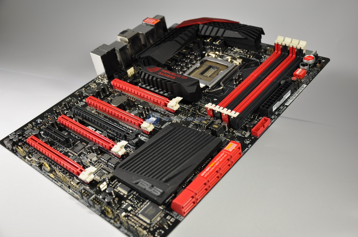 Nella seconda metà in basso troviamo gli slot d’espansione PCI-E e S-ATA. La zona perimetrale in basso è dedicata ai cavi provenienti dallo chassis. Il dissipatore identificato dal logo Republic of Gamers ha più una ragione estetica che funzionale.