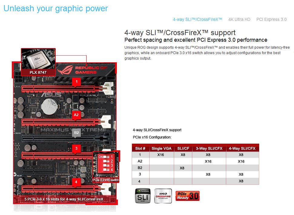 ASUS ha fatto un ottimo lavoro per massimizzare le prestazioni del comparto grafico. Lo switch PLX8747 permette di smistare il flusso di informazioni di 4 GPU permettendo di comunicare tra loro e nel frattempo con la CPU tramite le due connessioni x8 disponibili in Haswell. Al fine di evitare latenze addizionali inutili sarà possibile utilizzare il primo slot e lo slot nero B2 in configurazione 2-way SLI o CrossFireX nativa, quindi senza passare per il bridge PLX. L’intelligente posizionamento dello slot B2 permetterà di massimizzare la distanza tra due schede video, migliorandone l’areazione oppure permettendo l’installazione di schede video tri-slot.