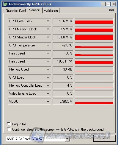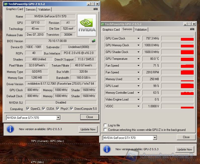 Il sistema di dissipazione utilizzato riesce a gestire abbastanza bene tali frequenze e le temperature in idle sono di 42°, in full le temperature salgono molto e dopo qualche minuto di FurMark raggiungono gli 80°. Pur essendo alte sono in linea con quelle di altre schede basate su chip GF 110.