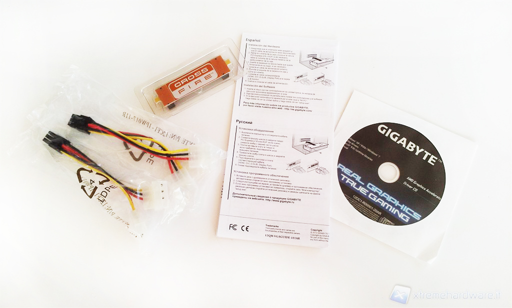 La confezione si apre lateralmente e racchiude al suo interno una scatola bianca in cartone rigido; una volta aperta troveremo subito la scheda video alloggiata all'interno di una busta antistatica e messa in sicurezza all'interno di un alloggiamento spugnoso. Sotto la scheda video troviamo un manuale rapido d'installazione e il disco contenente i driver; come al solito vi consigliamo di scaricare l'ultima versione dei driver attraverso il sito ufficiale AMD. Poco più sopra è presente un piccolo scompartimento contenente il limitatissimo bundle che comprende 2 adattatori 2xmolex to 6 pin ed il bridge d'interconnessione per la tecnologia CrossFire.