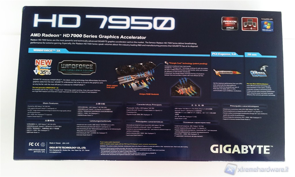 Nella parte posteriore troviamo alcune informazioni riguardanti il sistema di dissipazione WINDFORCE X3, la tecnologia PCI-Express 3.0 e il nuovo processo produttivo a 28nm. Vi sono inoltre elencate altre informazioni tradotte in varie lingue, ma non in italiano.
