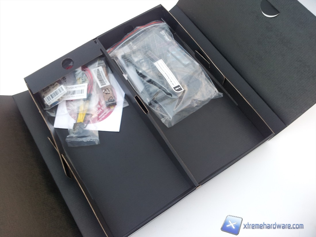 All'interno della confezione sono presenti due scatole nere, una più piccola contenente il bundle e una grande contenente la scheda. Contrariamente alla GTX 580 Matrix Platinum, il bundle è in teoria ben più ricco anche se, nel nostro caso, probabilmente a causa della non curanza di recensori precedenti, la maggior parte di esso era assente, la dotazione completa comprende: