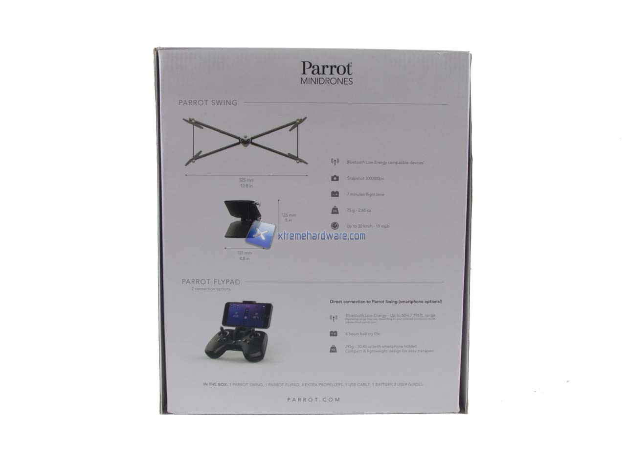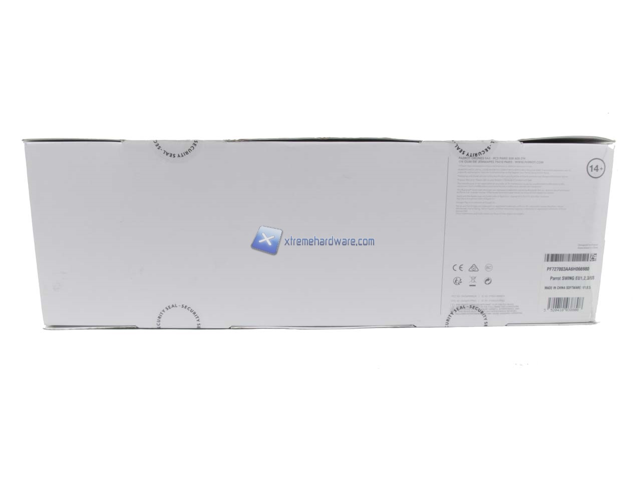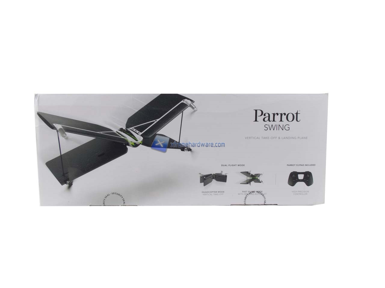 La confezione del Parrot Swing è di generose dimensioni e realizzata al solito in cartone. Questa presenta una grafica molto ben curata. Sono presenti diverse immagini illustrative e le immancabili specifiche tecniche di entrambi i prodotti contenuti.