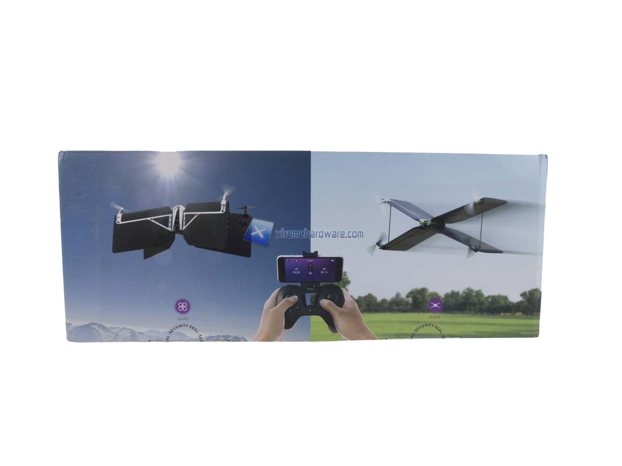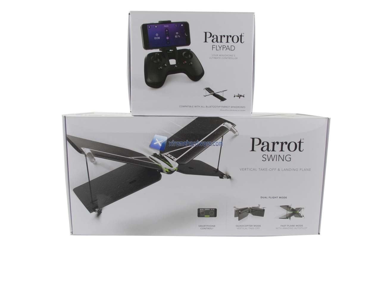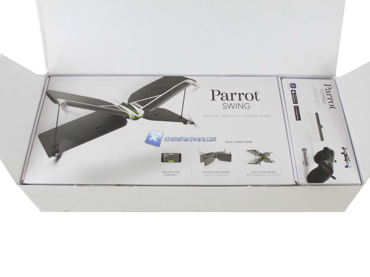 La confezione del Parrot Swing è di generose dimensioni e realizzata al solito in cartone. Questa presenta una grafica molto ben curata. Sono presenti diverse immagini illustrative e le immancabili specifiche tecniche di entrambi i prodotti contenuti.