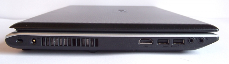 Sul lato sinistro del portatile troviamo l’ingresso per l’adattatore di corrente, la griglia per l’espulsione dell’aria calda, la porta HDMI, le due uniche porte USB 2.0 e gli ingressi jack.