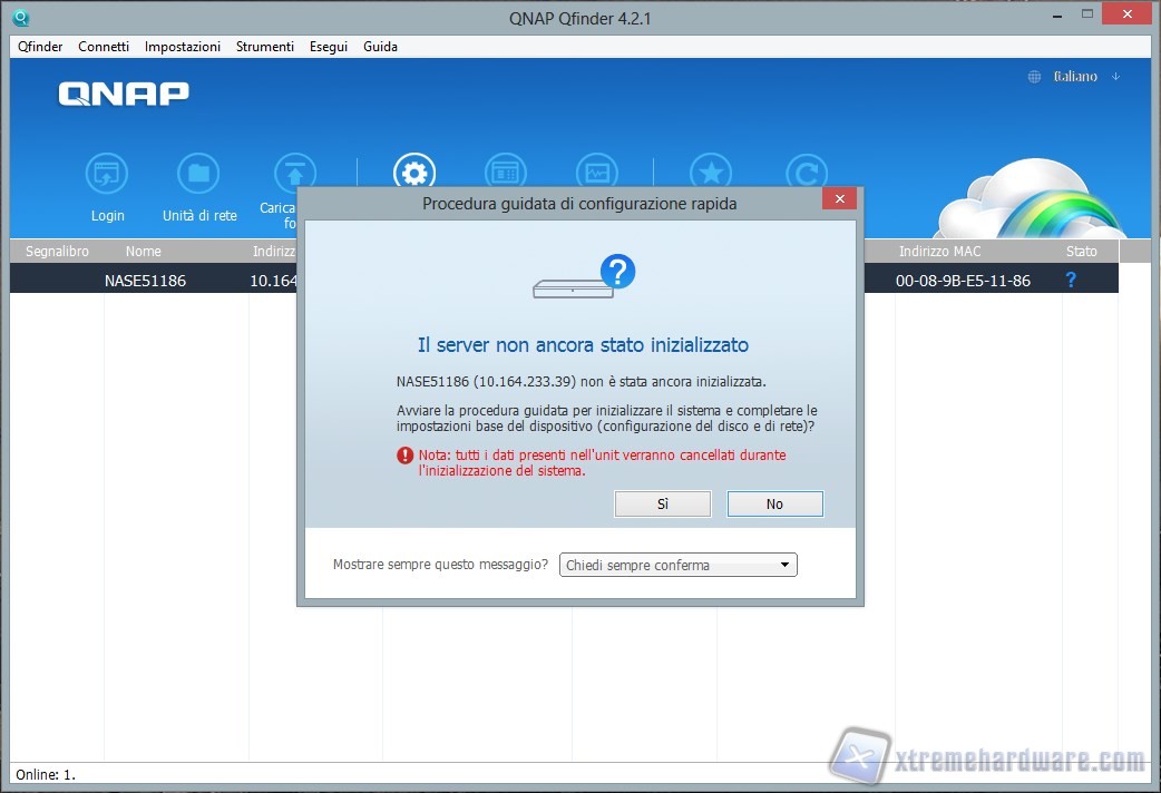 Una volta installato sarà il software stesso ad avvisarci che sulla rete è presente un NAS non ancora inizializzato; scegliamo dunque “SI” per far partire la prima configurazione.