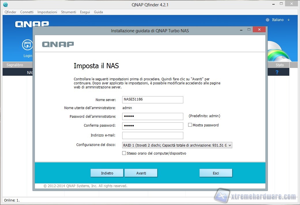 Seguiamo i vari passaggi e scegliamo la password di amministrazione, le impostazioni relative alla rete ed ai dischi installati.