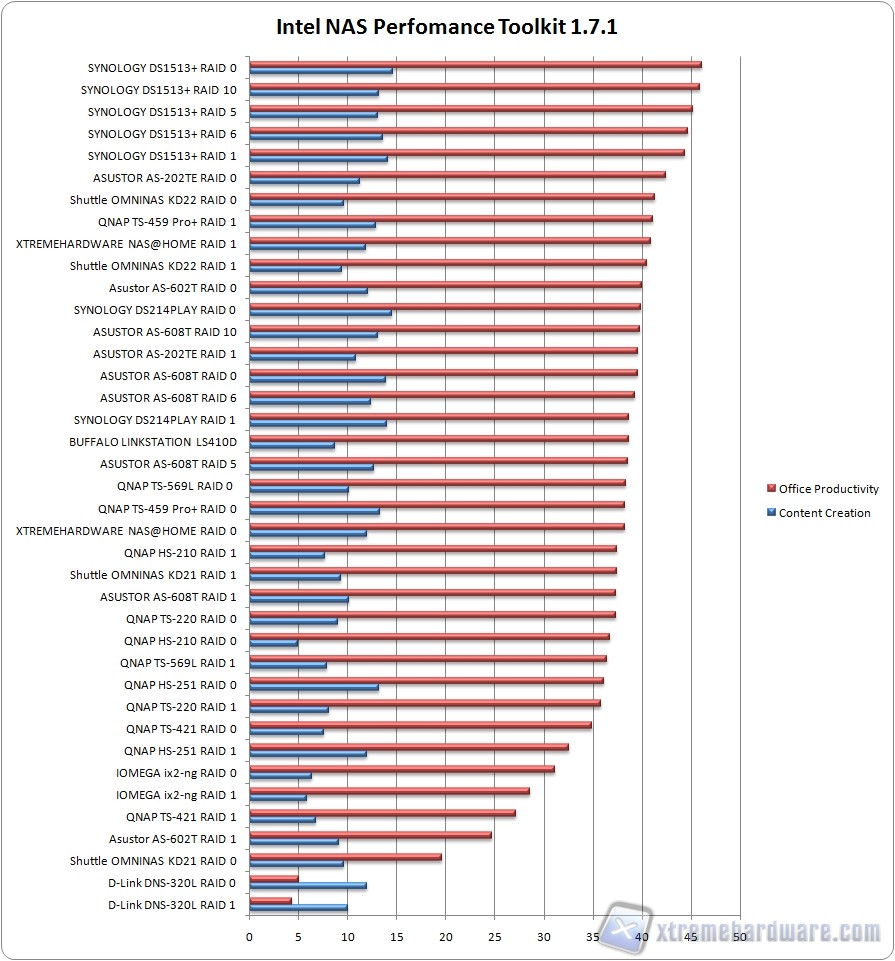 In questo caso i test “Content Creation” e “Office Productivity” fan posizionare il nostro NAS a metà classifica.