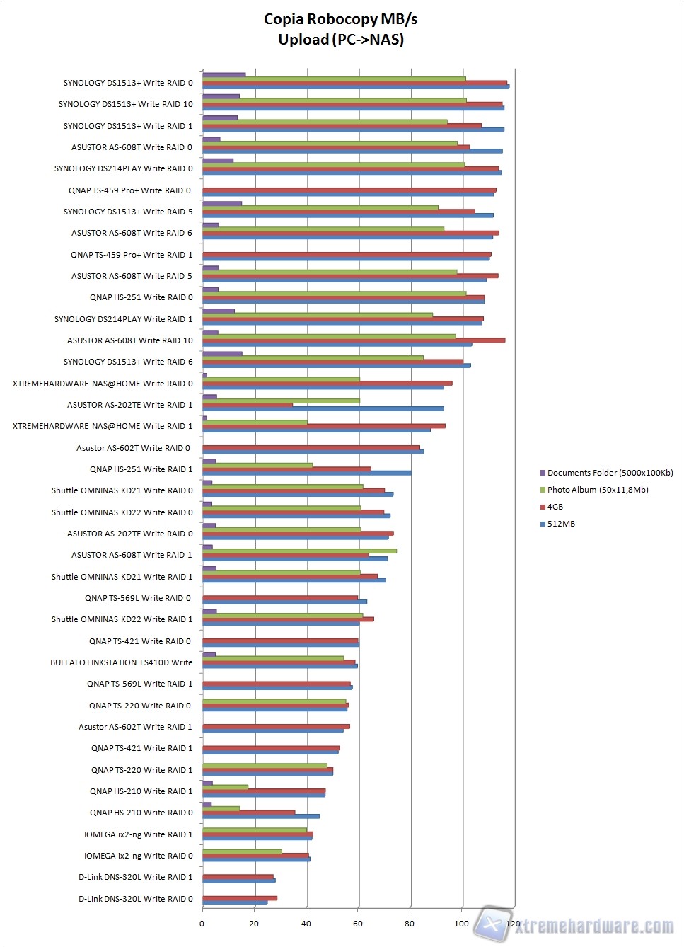 Effettuando il medesimo test ma con protocollo SMB ricaviamo risultati leggermente migliori in fase di download dati, dove l’HS-251 si posiziona a metà classifica raggiungendo i 100MB/s in configurazione RAID1.