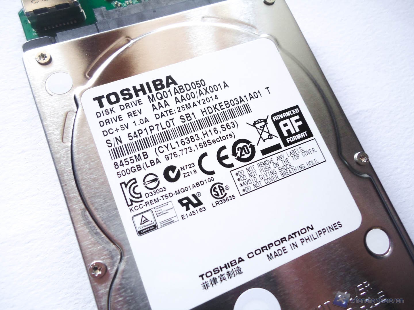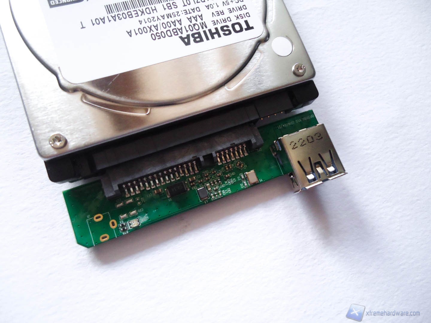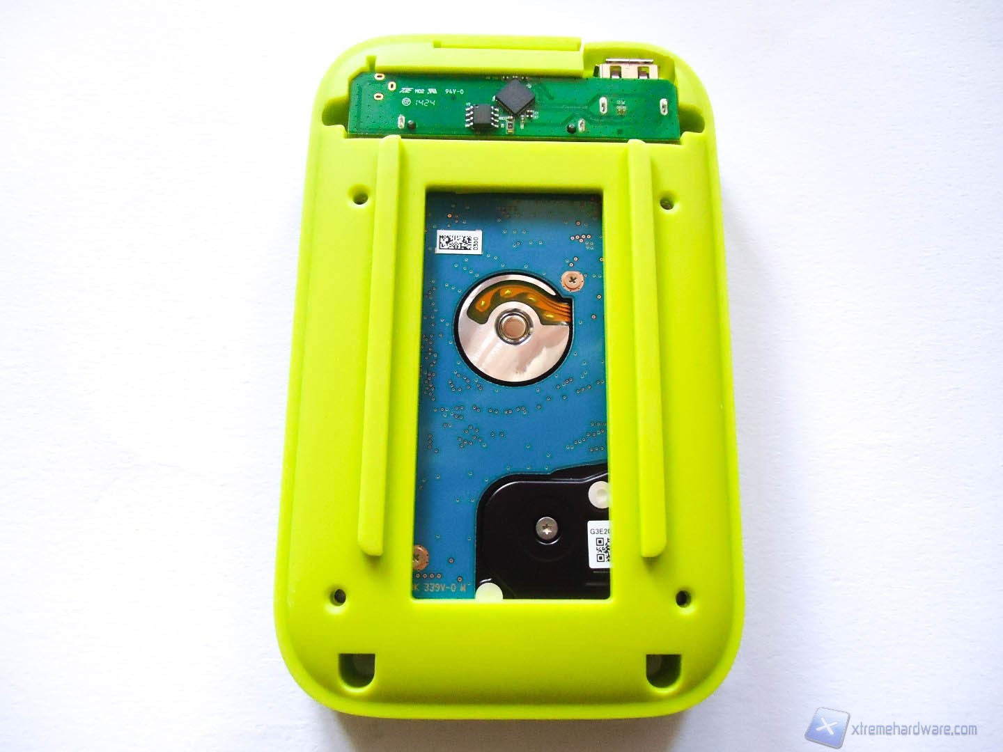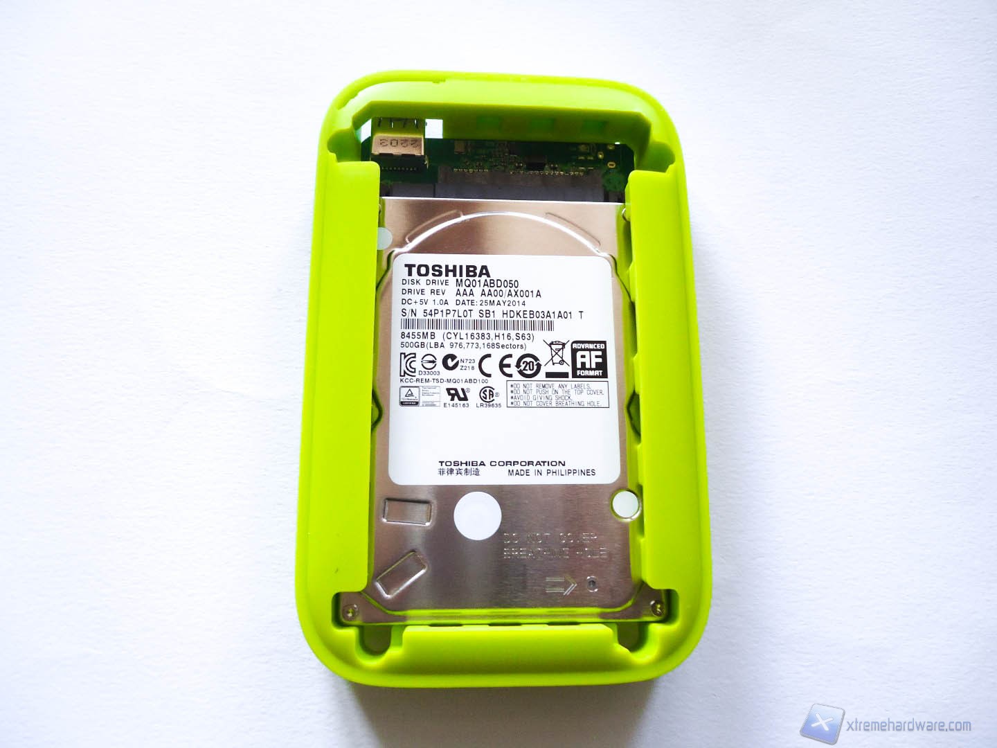 Abbiamo voluto aprire il box esterno dell’HD per farvi vedere quanto sia facile la manutenzione o l’eventuale upgrade dell’HD interno al prodotto. Rimuovendo le 4 viti inferiori possiamo smontare i due coperchi del prodotto che ci rivelano completamente la struttura in gomma e l’HD incastrato nella stessa in modo da mantenerlo al riparo dagl’urti. Una volta rimosso vediamo che l’Hard Disk, un Toshiba MQ01ABD050, è collegato tramite i connettori SATA a un piccolo PCB di colore verde sul quale è saldata la porta USB 3.0. In caso volessimo cambiare HD basterebbe separare lo stesso dal PCB, ma in questo caso la garanzia verrebbe meno.