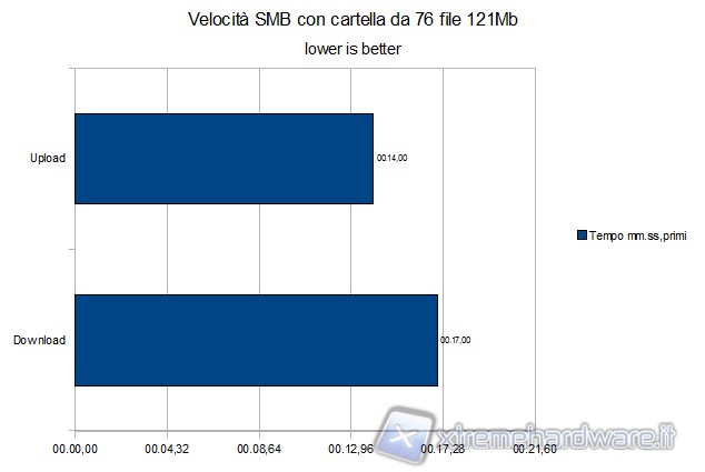 Abbiamo anche effettuato dei test di transfer rate, verificando il tempo necessario ad eseguire operazioni di upload e download mediante protocollo SAMBA o FTP. Sono stati presi come campione 4 file di dimensione diverse, si sono scelti principalmente file da 121mb, 700mb, 2.5gb e 5gb.