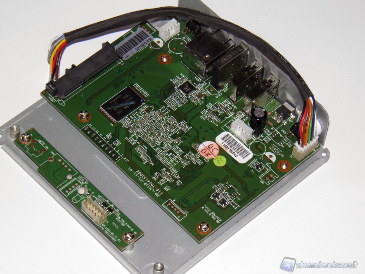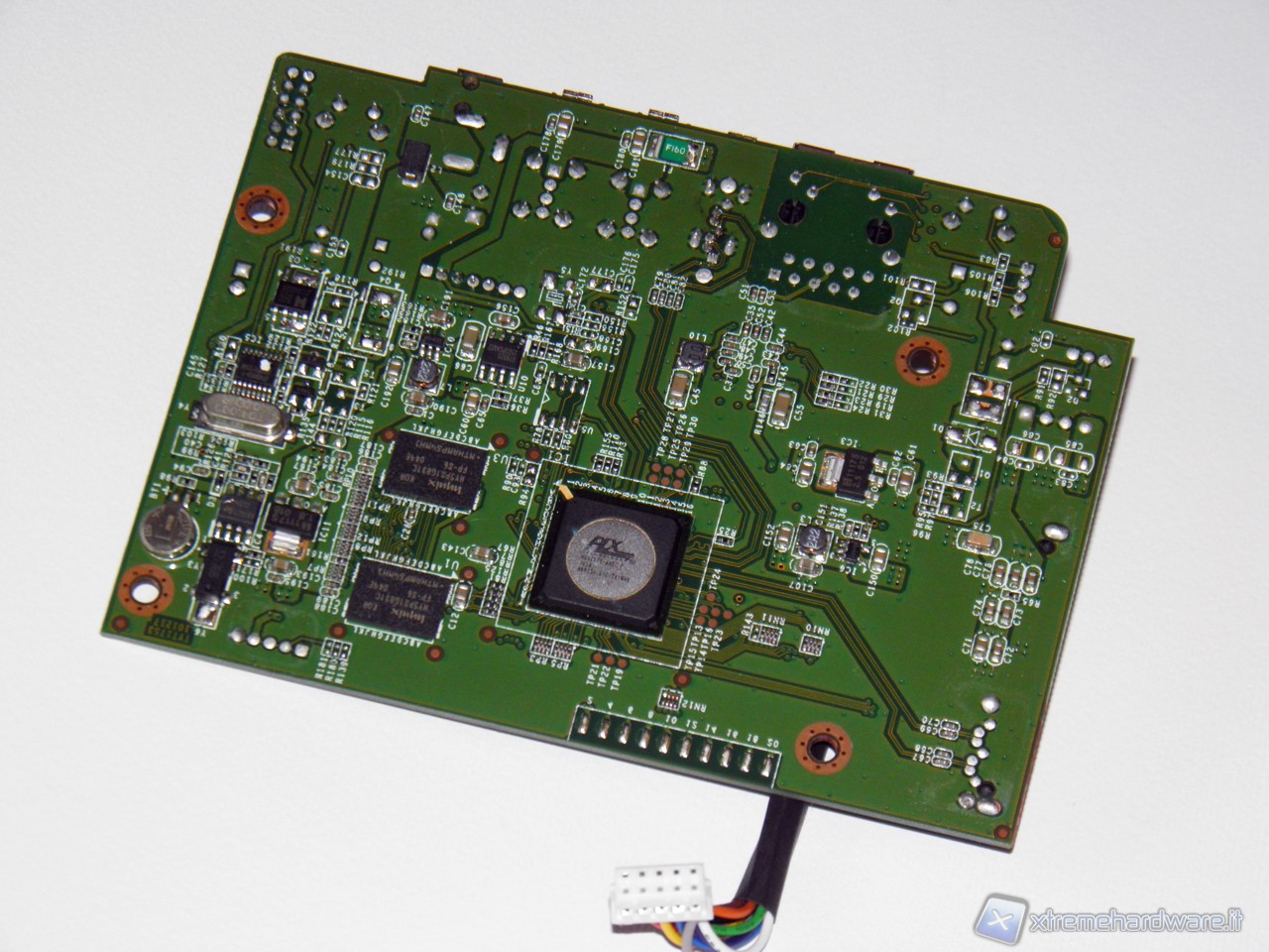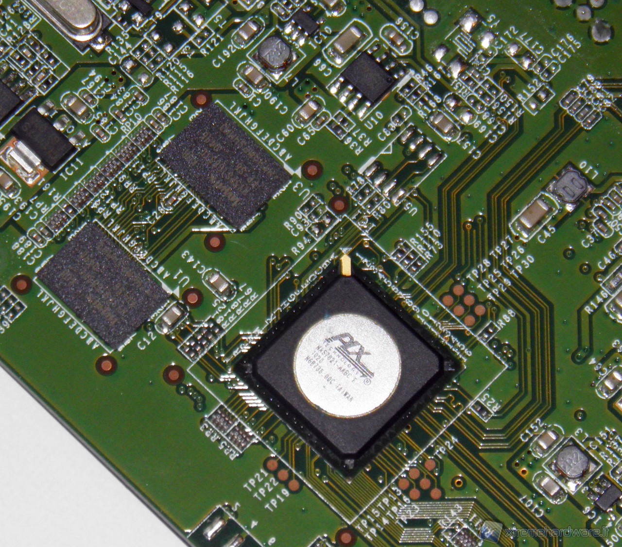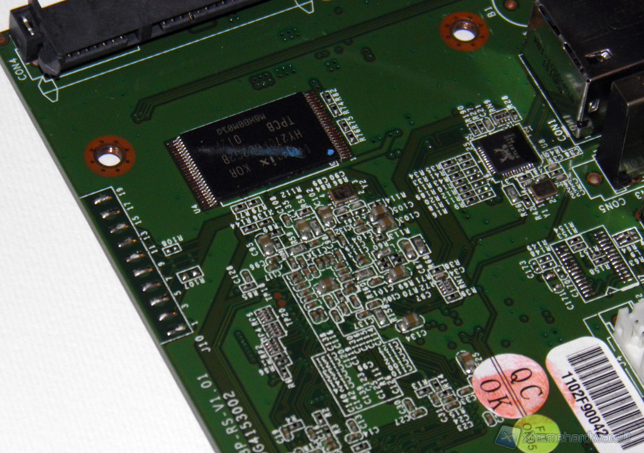 Esaminando la scheda andiamo ad individuare i componenti importanti presenti su di essa. Sul lato inferiore, quello visibile rimuovendo completamente la scheda, notiamo tre componenti principali. Sono il microcontrollore di produzione PLX, il NAS 7821 e i due moduli di RAM prodotti da Hynx.