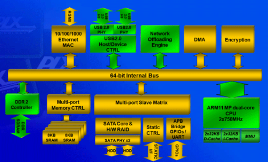 Per il primo, si tratta di una soluzione Dual Core basata su architettura ARM11, funzionante a 750Mhz per core. E' in grado di pilotare 2 porte USB 2.0, 2 porte SATA, 1 GigaLAN, gestire Raid di tipo 0/1 e controllare una linea PCI-E. Permette inoltre di effettuare il BOOT da HDD NAND (MLC/SLC) SPI NOR UART ed è in grado di crittografare in Hardware i dati secondo gli standard AES-256/SHA-1/2 per la sicurezza. Supporta fino a 512MB di RAM.