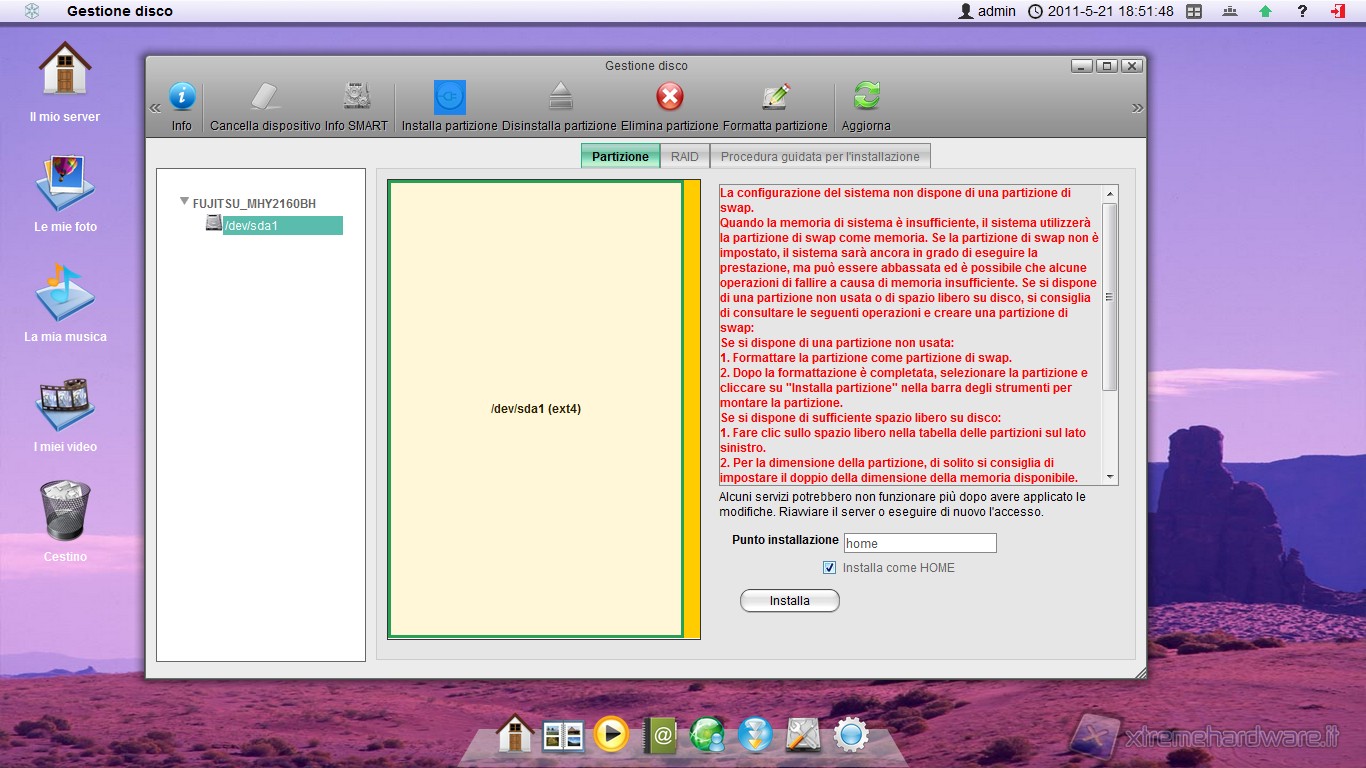 Una volta inseriti i dati, la prima operazione è l'inizializzazione del disco. Supponendo di avere un disco vergine, occorrerà prima formattarlo e poi installare la partizione. Notare che è possibile visionare anche lo stato smart dell'unità.