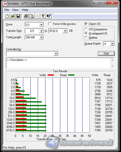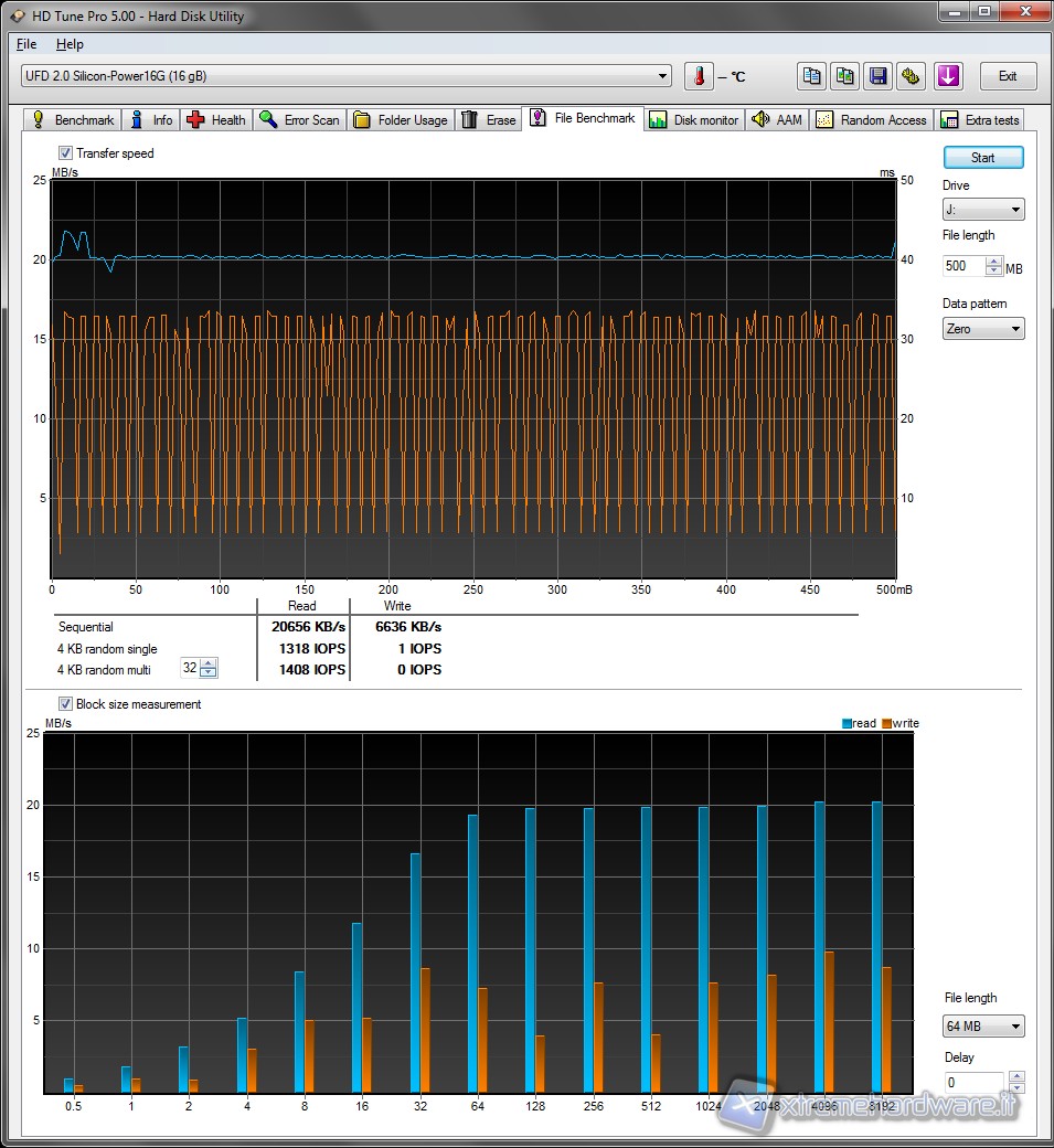 Ci conferma i valori che abbiamo già ottenuto con HD Tune, abbiamo un massimo di circa 20 MB/s in lettura fin da 64 KB costanti fino a 8 MB. Mentre in scrittura abbiamo una media di circa 7.5 MB/s costanti fin da blocchi di 64 KB a 8 MB.