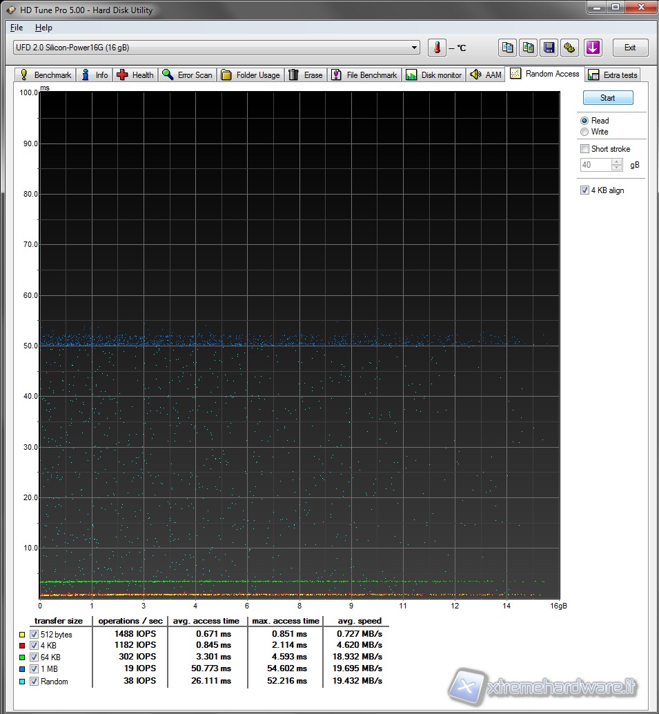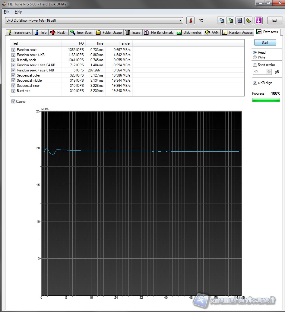 Anche i test eseguiti con questo benchmark confermano i valori precedentemente registrati dagli altri test. Abbiamo una media di lettura attorno ai 20 MB/s con un access time di circa 0,7 ms. Valori sicuramente buoni per un unità Flash Drive USB di seconda generazione.