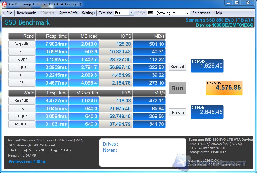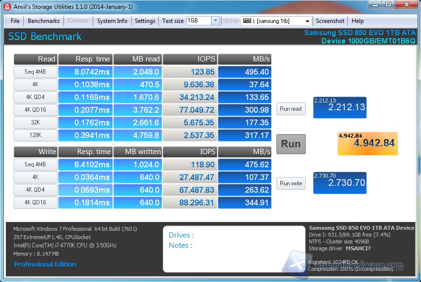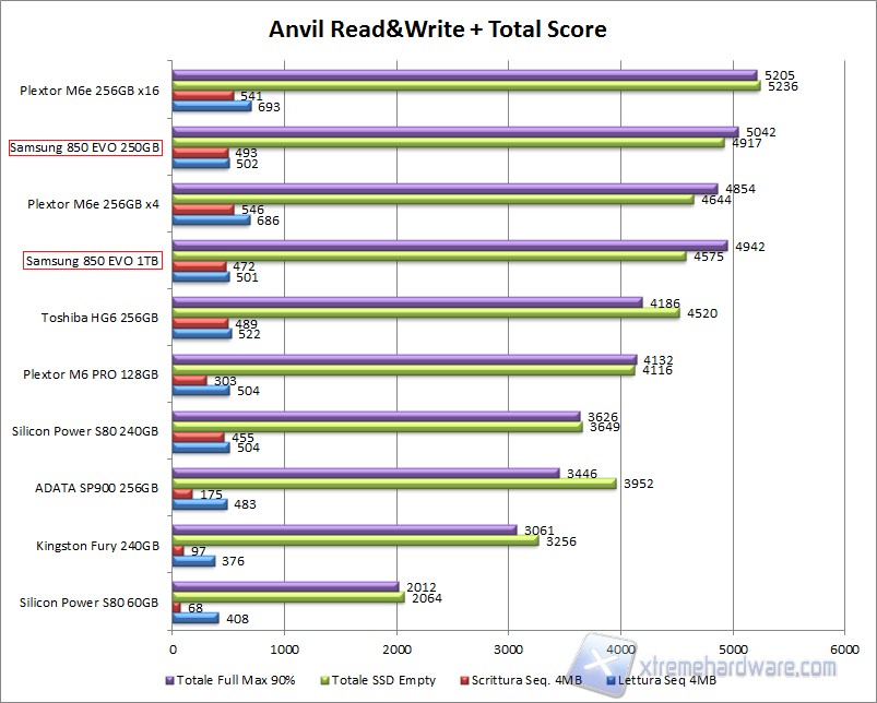 Questo nuovo bench introdotto nella nostra suite di test, chiamato Anvil's Storage Utilities, è pensato appositamente per gli SSD ed è in grado di testare i drive sotto ogni aspetto. I risultati ottenuti sono ottimi e li posizionano perfettamente nella zona alta del grafico. Con lo stesso Benchmark abbiamo provveduto ad effettuare i test occupando parte del drive (circa il 90%); è interessante notare come lo score non viene peggiorato dall’esiguo spazio disponibile sul device, anzi abbiamo ottenuto un punteggio anche migliore di quello ottenuto ad SSD vuoto, fatto che influiva molto sui controller Sandforce installati sui primi SSD sul mercato.