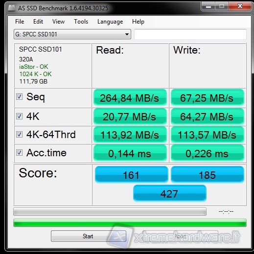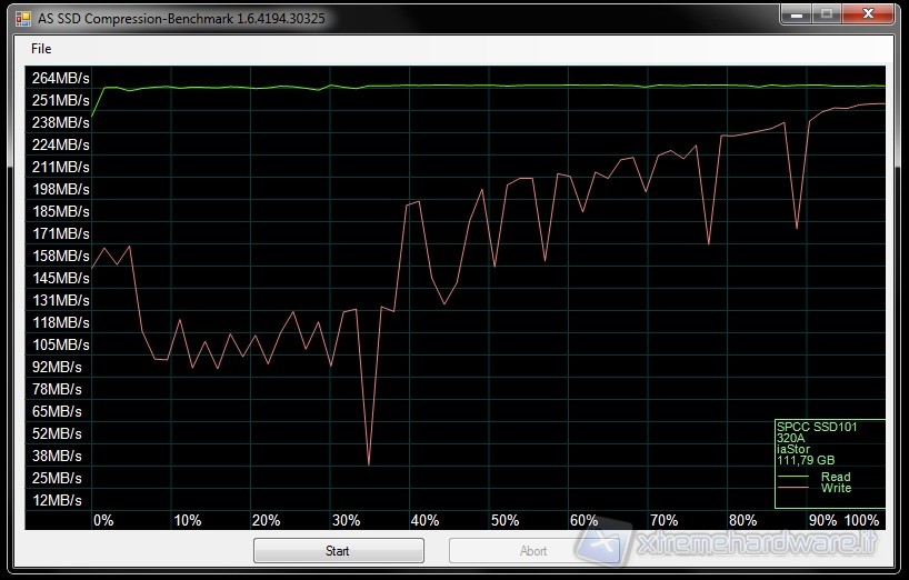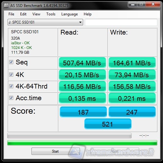 AS SSD Benchmark è un'altro benchmark gratuito studiato appositamente per SSD. Effettua i suoi test sintetici senza adoperare la cache del sistema operativo che va ad influenzare pesantemente i risultati del Transfer Rate, inoltre determina i tempi di accesso del drive sfruttando l'intera capacità del drive stesso. Tutti i test vengono effettuati utilizzando dati non comprimibili.