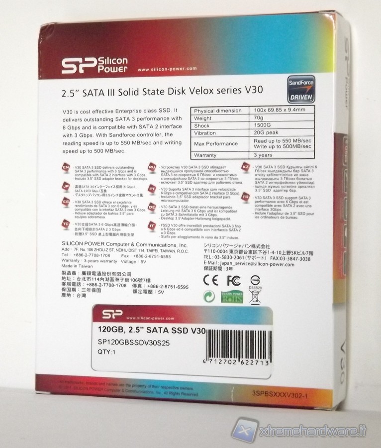 Il Solid State Disk è alloggiato in una confezione di cartone con lo sfondo principalmente di colore bianco. Sulla parte frontale è possibile, tramite un'apposita finestra, osservare fisicamente l'SSD Velox V30. Come è possibile notare dalle foto, nella parte frontale, spiccano alcune informazioni preliminari, come la dicitura del modello che in questo caso è V30, il form factor 2.5", interfaccia Sata III 6 Gbps e la dicitura SSD che ci fa capire che si tratta di un Solid State Disk e non di un disco meccanico tradizionale. Naturalmente non mancano il logo di Silicon-Power ed altri piccoli loghi come Sata III 6 Gbps, Silent Operation, Low Power Consumption, Shock Resistant e Adapter Bracket incluso nella dotazione.